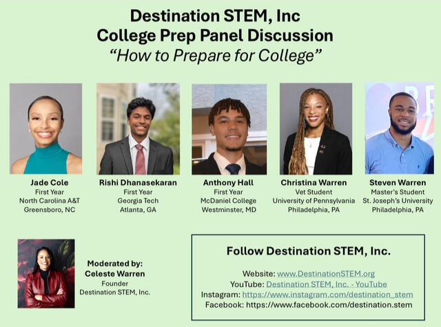 Destination STEM is a nonprofit organization created to provide resources to students of color and students in need pursuing degrees in science, technology, engineering and mathematics (STEM) related fields.- Our desire is to help students of color and those in need see the possibilities that exist by exposing them to opportunities to learn about STEM related fields- We provide awareness and education programs as well as other resources to students pursuing STEM degrees